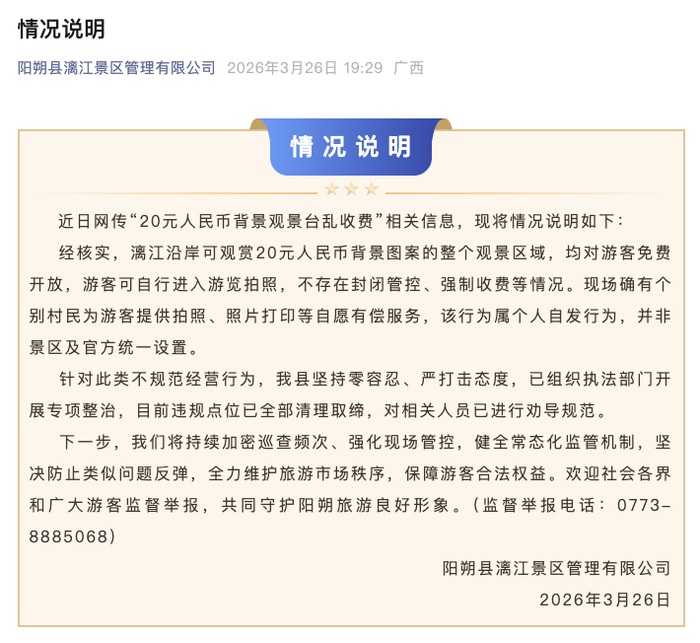 央视网消息:3月26日,桂林阳朔县漓江景区发布关于网传“20元人民币背景观景台乱收费”的情况说明称:经核实,漓江沿岸可观赏20元人民币背景图案的整个观景区域,均对游客免费开放,游客可自行进入游览拍照,不存在封闭管控、强制收费等情况。现场确有个别村民为游客提供拍照、照片打印等自愿有偿服务,该行为属个人自发行为,并非景区及官方统一设置。针对此类不规范经营行为,该县坚持零容忍、严打击态度,已组织执法部门开展专项整治,目前违规点位已全部清理取缔,对相关人员已进行劝导规范。