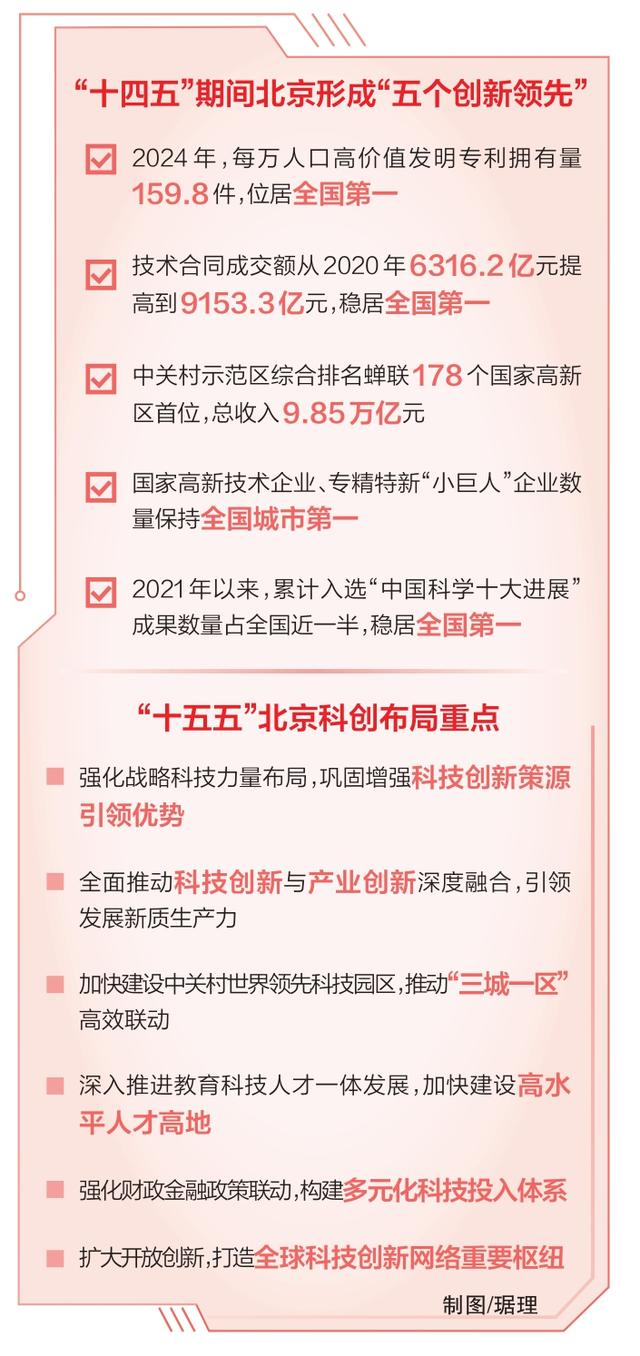 铺开“十五五”蓝图,具有全球影响力的国际科技创新中心蓄势待发。北京将加强央地协同、深化区域联动,努力建成全球重要科学策源地、未来产业引领地、开放创新核心枢纽和高水平人才高地。
