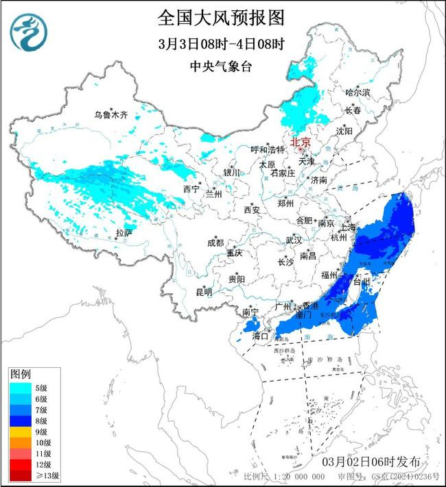 央视网消息:中央气象台3月2日06时继续发布大风蓝色预警,预计,3月2日08时至3日08时,新疆东部、西藏中西部、青海北部、内蒙古大部、江苏东部等地将有5~6级、阵风7~8级的大风;黄海中部和南部海域、东海大部海域、台湾海峡、台湾以东洋面、南海东北部偏北海域将有7~8级、阵风9级的大风,其中黄海东南部海域、东海北部海域风力可达9~10级、阵风11级。