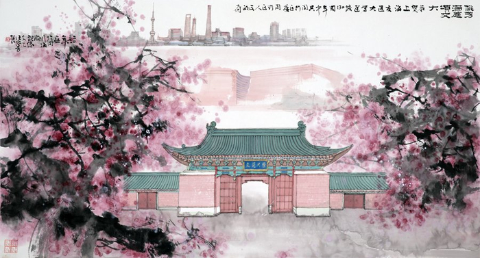 细细欣赏,画作以上海交大校门为视觉核心,沉稳庄重的线条凸显百卅学府的文化气度;满庭繁盛的桃花,寄寓“桃李满天下”的美好期许,礼赞一代代交大学子从校园启航,深耕各行各业、服务国家发展。与此同时,画作将“大零号湾”与城市天际线纳入画面,在校区、园区与城区之间建立起更广阔的空间联系,赋予作品更深刻的时代内涵。