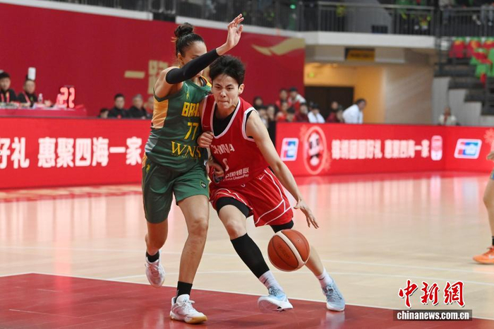 3月4日,2026年中国女篮热身赛(长沙站)首场比赛举行,中国队以74:69险胜巴西队。图为中国队队员杨舒予(红)带球突破。中新社记者 杨华峰 摄