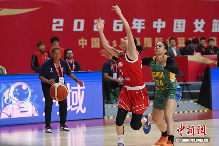 3月4日,2026年中国女篮热身赛(长沙站)首场比赛举行,中国队以74:69险胜巴西队。图为中国队队员王思雨(红)被对手犯规。中新社记者 杨华峰 摄