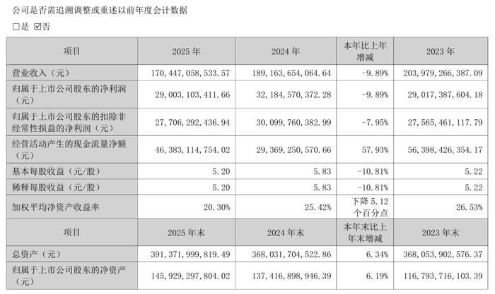 财报显示,2025年,格力电器实现营收1704.47亿元、同比下降9.89%,归母净利润290.03亿元、同比下降9.88%。