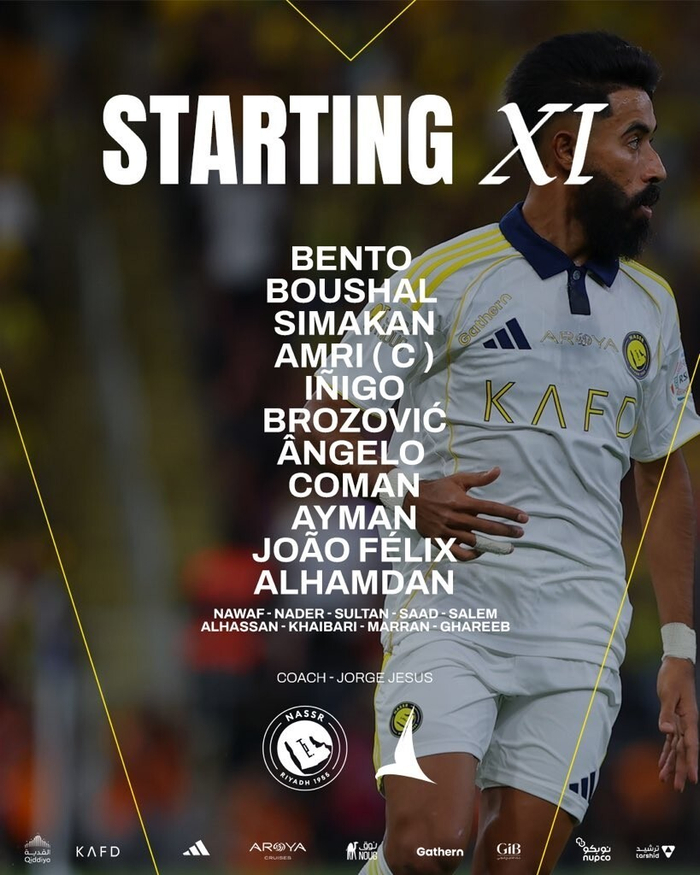 利雅得胜利首发:24-本托、26-伊尼戈-马丁内斯、5-阿卜杜拉-阿姆里、3-西马坎、12-纳瓦夫-布歇尔、23-艾曼-叶海亚、20-安热洛-博尔热斯、11-布罗佐维奇、21-金斯利-科曼、9-阿卜杜拉-哈姆丹、79-菲利克斯