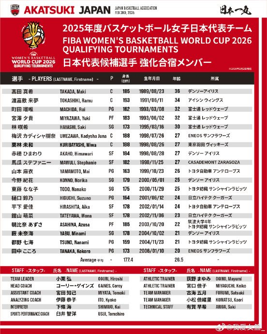 【高田真希、田中心领衔 山本麻衣、町田瑠唯回归日本女篮集训名单】近日,日本篮协宣布,为备战2026年3月11日在土耳其伊斯坦布尔举办的“2026 年国际篮联女子篮球世界杯预选赛”,将于2月20日起开展强化集训,并公布了参加集训的19名运动员名单。此次名单中,有11名球员参加过世界杯或亚洲杯,除了此前在亚洲杯表现亮眼的新星田中心,高田真希、宫泽夕贵、渡嘉敷来梦和马乌里等上届世界杯和亚洲杯的主力球员也都悉数入选。此外没有参加上届亚洲杯的山本麻衣和町田瑠唯也在此次集训中回归了国家队。这支集训队伍的平均年龄为26.5岁,年龄最大的高田真希和年龄最小的田中心相差了16岁之多。#女篮世界杯[超话]#