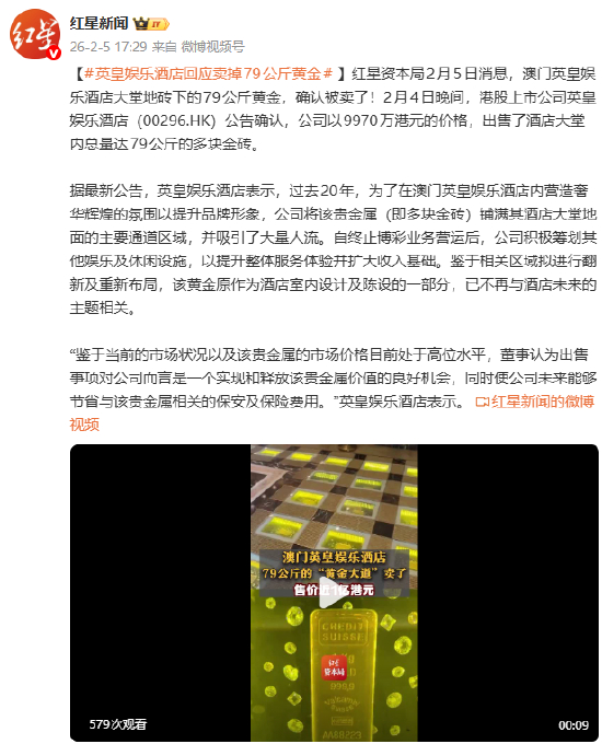 [#英皇娱乐酒店回应卖掉79公斤黄金# ]红星资本局2月5日消息,澳门英皇娱乐酒店大堂地砖下的79公斤黄金,确认被卖了!2月4日晚间,港股上市公司英皇娱乐酒店(00296.HK)公告确认,公司以9970万港元的价格,出售了酒店大堂内总量达79公斤的多块金砖。