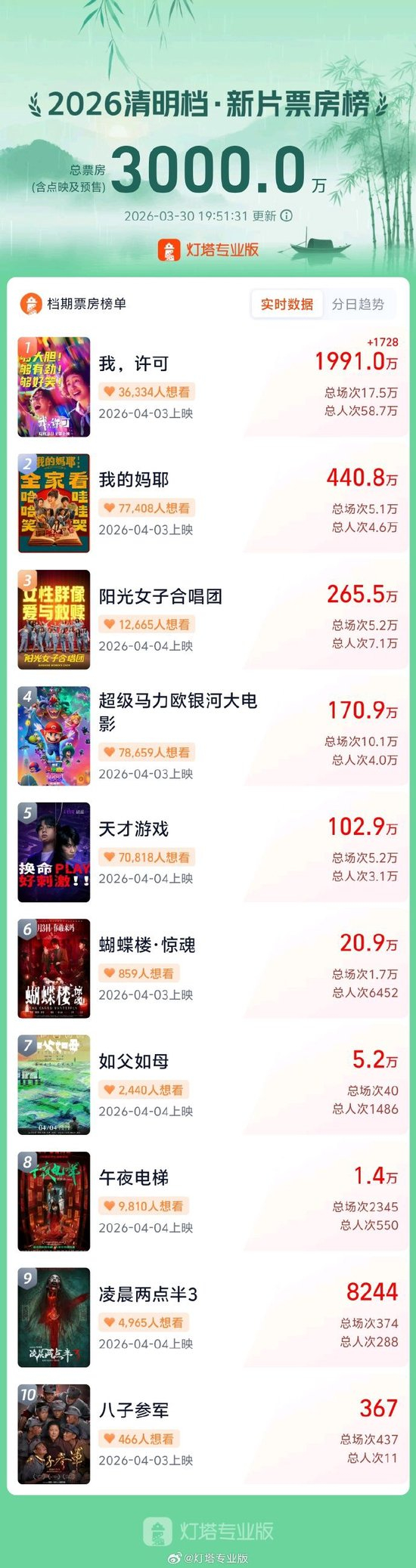 据灯塔专业版,截至3月30日19时51分,2026年清明档新片点映及预售总票房突破3000万元,影片《我,许可》《我的妈耶》《阳光女子合唱团》《超级马力欧银河大电影》《天才游戏》暂列前五。