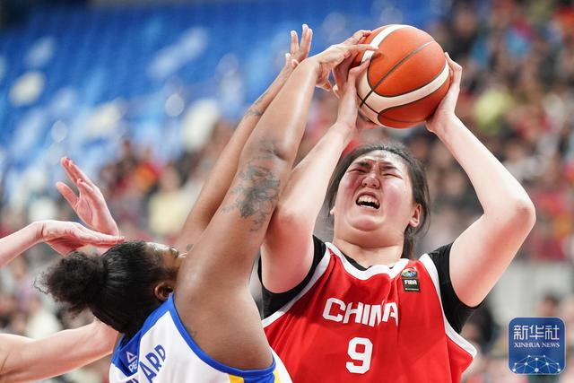 ↑ 中国队球员杨舒予(左)在比赛中带球突破。