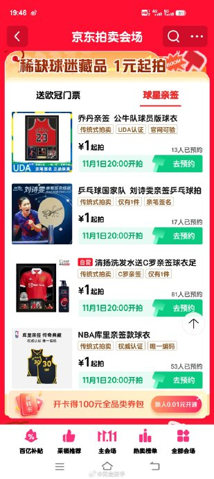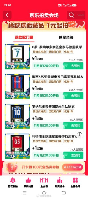 ????#梅西C罗签名球衣京东拍卖# 京东球星亲签藏品1元起拍,赢欧冠门票!活动将在今晚20:00火爆开启,球迷拍品现已全部上线预约,战况异常激烈!萨内蒂、菲戈等足坛巨星的亲签球衣、球鞋等珍贵藏品纷纷亮相,均由欧洲豪门俱乐部官方授权直采,附有鉴定认证。