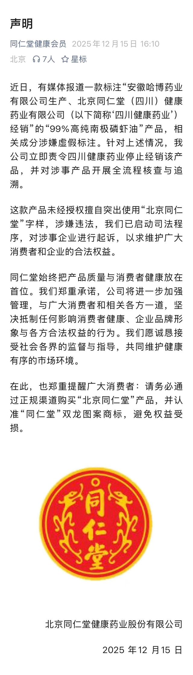 涉事磷虾油产品,外包装上的“北京同仁堂”大字异常醒目,宣传页面上也标称产品品牌为“同仁堂(TRT)”,消费者自然以为这是老字号出品。可这款打着“磷脂含量43%”的产品,实际上一点儿磷虾油都没加,哪有一丝老字号的品质?12月15日,北京同仁堂健康药业股份有限公司发表声明:责令侵权企业北京同仁堂(四川)健康药业有限公司停止经销该产品,并启动司法程序,起诉侵权企业。