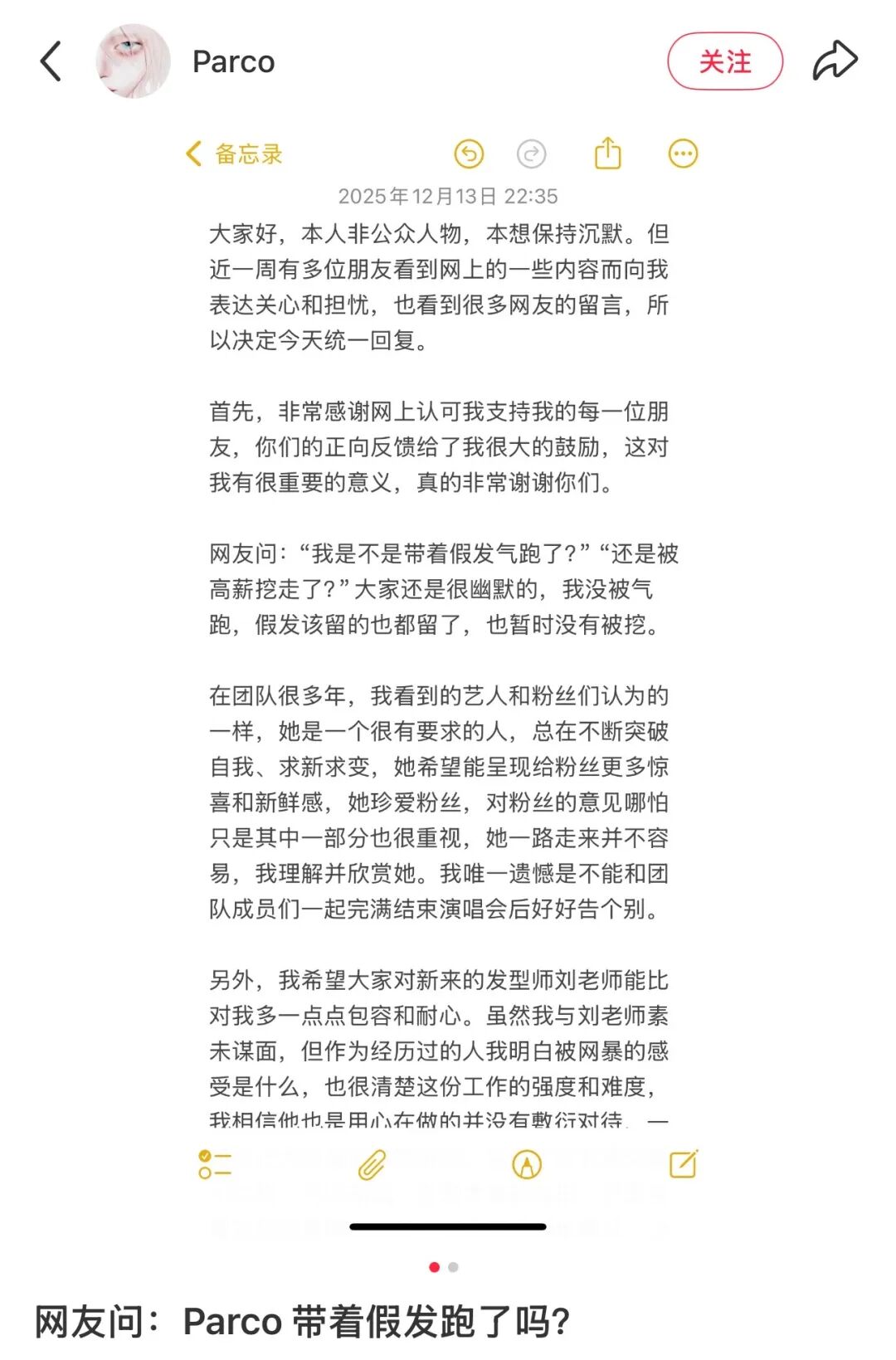 对于张韶涵新发型师刘老师,张振Parco呼吁,虽素未谋面,但作为经历过被网暴的人,理解刘老师工作强度与被网暴感受,相信其是用心做、未敷衍的:“希望大家能因为喜爱艺人而对艺人团队也多一点点温度,这也是对自己喜欢的艺人的一种支持。”
