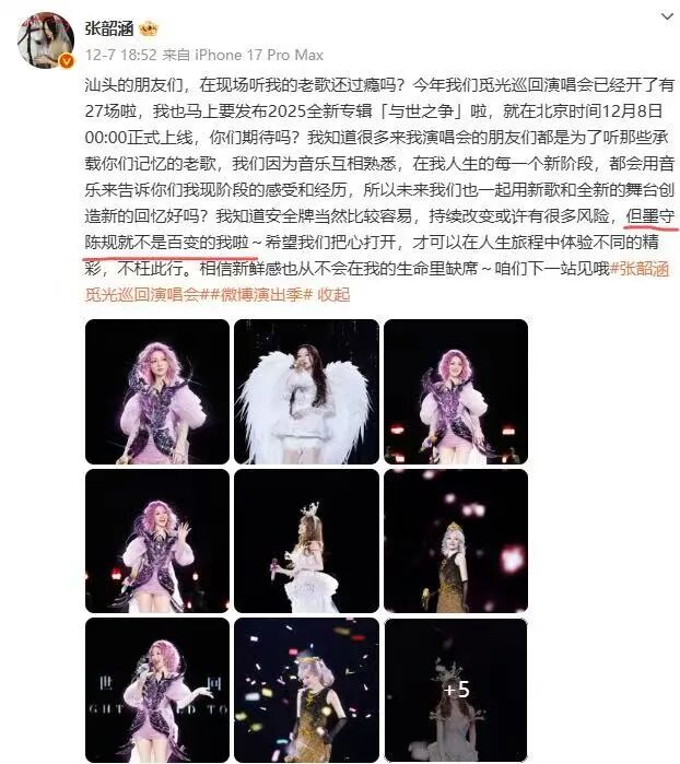 随后,12月7日,张韶涵发布微博:“我知道安全牌当然比较容易,持续改变或许有很多风险,但墨守陈规就不是百变的我啦~希望我们把心打开,才可以在人生旅程中体验不同的精彩,不枉此行。相信新鲜感也从不会在我的生命里缺席~”