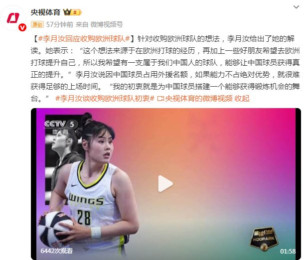 如今李月汝接受央视《篮球公园》节目采访,李月汝正式回应收购欧洲球队事宜。李月汝对此表示:“这个想法源于在欧洲打球的经历,再加上一些好朋友希望去欧洲篮球联赛打球提升自己,所以我希望拥有一支属于我们中国人的球队,能够让中国球员获得真正的提升。因为中国球员占用外援名额,如果能力不占绝对优势,就很难获得足够上场时间。”