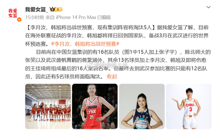 由于目前距离女篮世预赛支剩下不到一个月的时间,这也就意味着,李月汝和韩旭归队后,这便是女篮的最强阵容。目前女篮16人集训名单上,蒋子涵和张笑,他们已经确定无缘最终世预赛大名单了。换句话说,剩下的14人和归队的韩旭、李月汝,将会是这一次女篮世预赛的大名单。也就是说,女篮至少还会有4名球员会被裁掉。按照目前的情况来看,宫鲁鸣会选择裁掉谁呢?