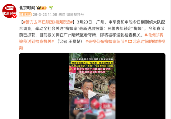 3月23日,申军良和申聪到刑侦大队配合调查,牵动全社会关注“梅姨案”最新进展披露:民警去年锁定“梅姨” ,今年春节前已抓获,目前被关押在广州增城区看守所,即将被移送到检察机关。