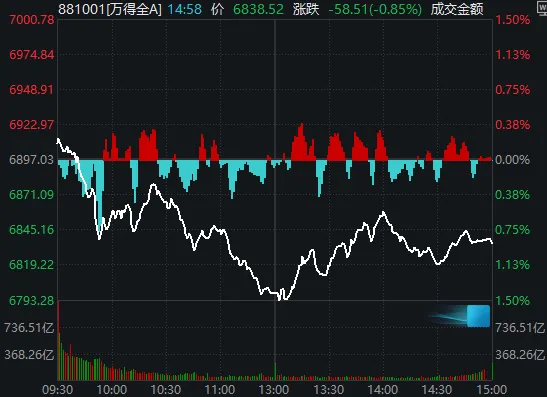 全市场近4100只个股下跌。沪深两市成交额2.8万亿元,较上一个交易日放量2447亿元。