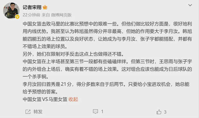 也希望比利时队的这场大胜,能点醒宫鲁鸣:中国女篮现阶段,还是得围绕李月汝、韩旭这2大高点来丰富战术,张子宇应该视为主力替补,而非绝对核心。
