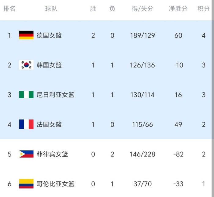 韩国女篮目前出线形势一片大好,这个小组尼日利亚作为非洲冠军,与东道主德国队一起提前拿到了世界杯的入场券,剩下的4支球队争夺两个名额,而本小组菲律宾与哥伦比亚都是鱼腩,韩国拿下尼日利亚后,击败菲律宾和哥伦比亚应该不在话下,最后很有可能拿到3场胜利,出线前景很稳,朴智贤与姜怡瑟组成了韩国队的双核,在与尼日利亚的比赛中,姜怡瑟三分很铁,但是她依然自信出手,朴智贤现在很有自信,韩国还是更多的依赖外线,和她们的男篮打法类似!