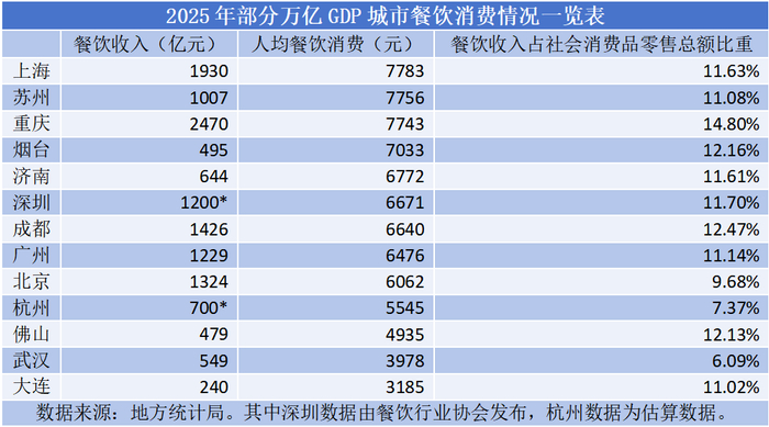另有5座城市人均餐饮消费超6000元,分别是济南(6772元)、深圳(6671元)、成都(6640元)、广州(6476元)和北京(6062)。人均餐饮消费最低的城市,是新晋万亿GDP城市之列的大连市,2025年人均餐饮消费3185元。同时大连亦是餐饮收入最低的城市,2025年为240亿元,约重庆的十分之一。
