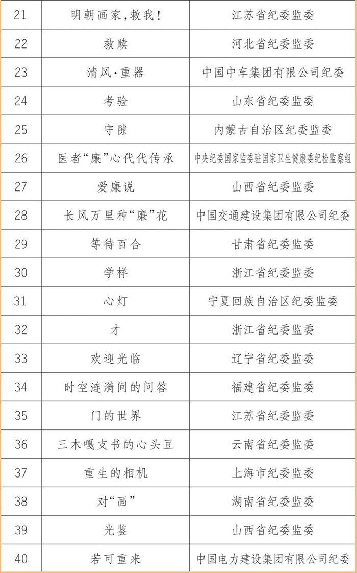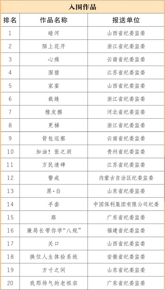 近日,由中央纪委国家监委宣传部、中央宣传部文艺局、中央网信办网络传播局联合主办,人民网承办的新时代廉洁文化微短剧征集展播活动,公布了20部优秀作品、40部入围作品(名单附后)。浙江省纪委监委、山西省纪委监委、中央纪委国家监委驻中国证监会纪检监察组等10家单位获评优秀组织单位。