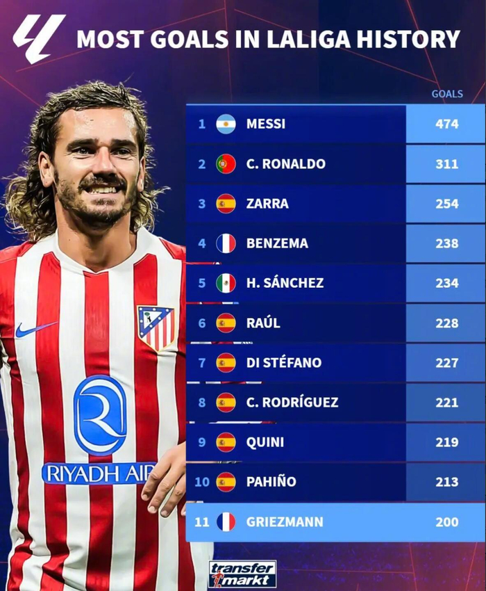 西甲历史射手榜:梅西474球居首、C罗311球次席,格里兹曼跻身前11