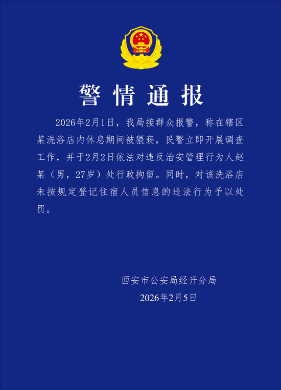 西安市公安局经开分局2月5日通报:2月1日,该局接群众报警,称在辖区某洗浴店内休息期间被猥亵,民警立即开展调查工作,并于2月2日依法对违反治安管理行为人赵某(男,27岁)处行政拘留。同时,对该洗浴店未按规定登记住宿人员信息的违法行为予以处罚。