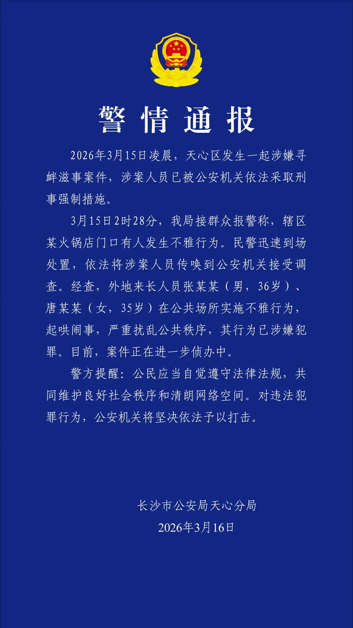 央视网消息:3月16日晚,长沙市公安局天心分局发布警情通报:2026年3月15日凌晨,天心区发生一起涉嫌寻衅滋事案件,涉案人员已被公安机关依法采取刑事强制措施。3月15日2时28分,我局接群众报警称,辖区某火锅店门口有人发生不雅行为。民警迅速到场处置,依法将涉案人员传唤到公安机关接受调查。经查,外地来长人员张某某(男,36岁)、唐某某(女,35岁)在公共场所实施不雅行为,起哄闹事,严重扰乱公共秩序,其行为已涉嫌犯罪。目前,案件正在进一步侦办中。