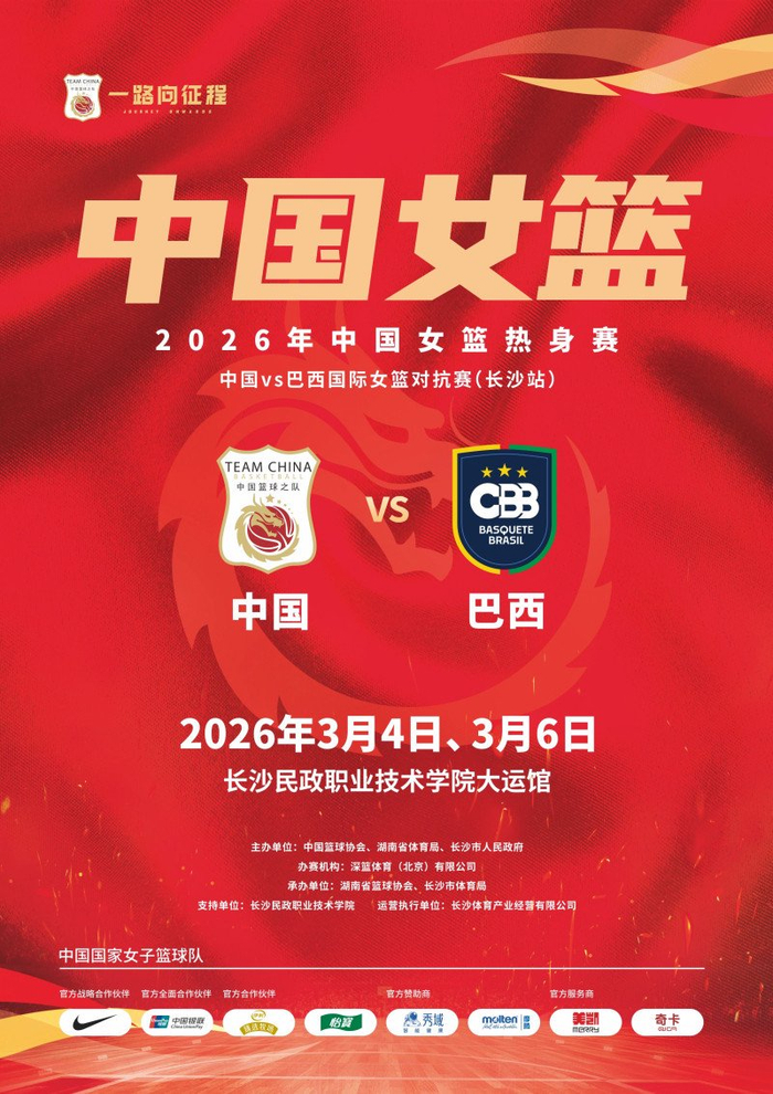 长沙晚报掌上长沙2月4日讯(全媒体记者 赵紫名)2026年国际篮联女篮世界杯资格赛将于3月中旬打响,中国女篮目前已经进入集训备战阶段。3月4日、6日,中国女篮将在长沙民政职业技术学院大运馆迎战南美劲旅巴西女篮,这两场热身赛既是检验集训成效、磨合战术体系的关键实战,也是中国女篮马年的第一战。