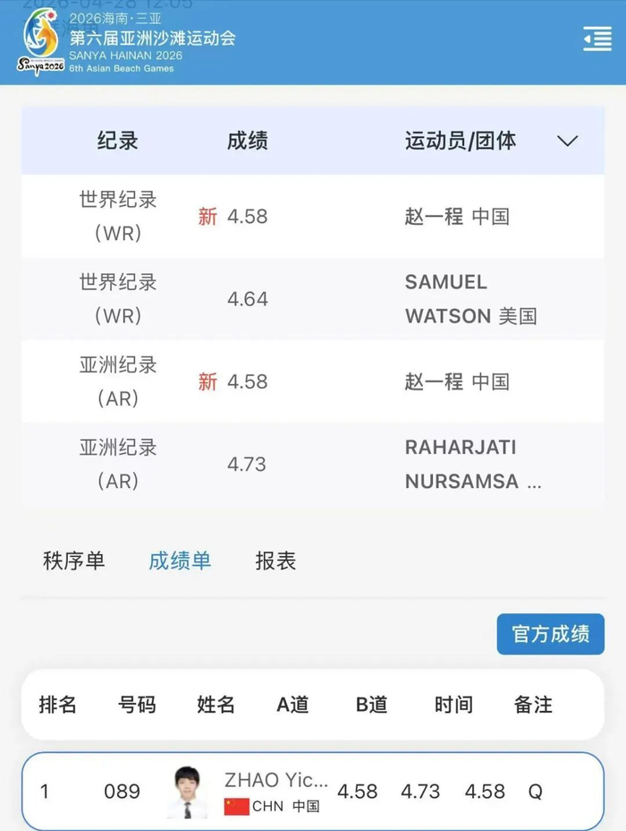 北京时间4月28日,第六届亚沙会男子速度攀岩预赛中,上海运动员赵一程以4秒58的成绩打破美国选手Samuel Watson此前创造的4秒64的世界纪录!赵一程也成为世界上首位在速度攀岩项目中进入4秒60的运动员!凭借这一成绩,赵一程也以预赛第一的成绩进入今晚进行的亚沙会男子速度攀岩决赛。